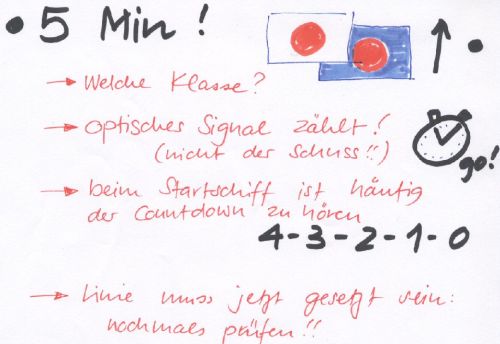 Ist man dann auf dem Kurs unterwegs, können weitere Signale gegeben werden. Darum unbedingt auch während der Wettfahrt auf Schallsignale und Flaggen achten.