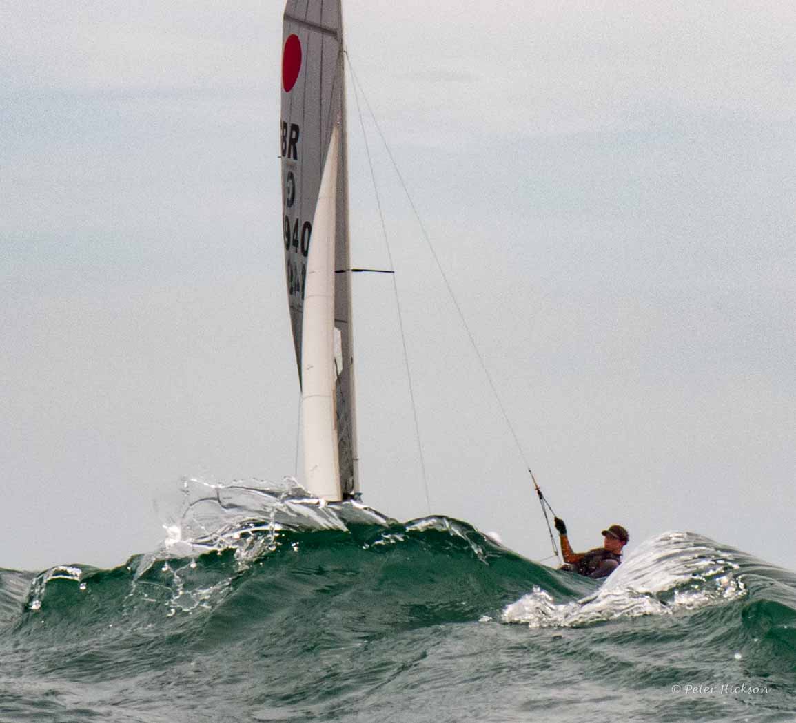 Beim anfänglich kräftigen Westwind, am zweiten Tag aus Südwest, hatte niemand einen Stich gegen Gillard/Anderton. Die nahmen nach dem Start dicht und dampften auf und davon. Im 2. Lauf rundeten wir dank schönem Rechtsdreher die Luvboje in Front. Auf dem folgenden Vorwinder zeigten die GBRs aber, wie man schneller nach Lee kommt: Vorwindkreuzen haben sie drauf. Wir nicht. Chancenlos, den richtigen Winkel auf Anhieb zu finden. Aber wir waren ja zum Lernen da...