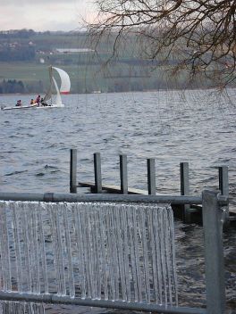 Eiszapfensegeln Hallwilersee15. DezemberNomen est Omen! Diesmal so richtig. Bei Bise und langen Eiszapfen segeln 5 Teams...Eingefrorene Trapeze, kalte Hände und Füsse und eine feine Eisschicht auf dem Deck. Das diesjährige Eiszapfen-Segeln in Beinwil erwies seinem Namen alle Ehre. Trotzdem wagten sich bei bis zu drei Beaufort Windstärke fünf Fireballs aufs Wasser. Spass hat es allen gemacht und Hochprozentiges gemischt mit Fondue liess am Ende die klammen Finger wieder auftauen.