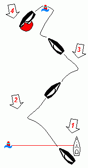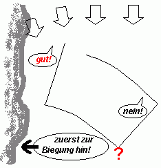 Liegt die Luvboje nicht weiter als 5 km vom Ufer entfernt, ist es wegen der zu erwartenden Windbiegung vorteilhaft, die letzte Annäherung von links zu machen!