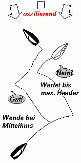 Für den langfristig grössten Gewinn ist der Zeitpunkt der Wende wichtig: Für das richtige Timing ist es von Vorteil, wenn der Vorschoter den gesegelten Kurs im Verhältnis zum Mittelkurs angibt. 10° über dem Mitttelkurs heisst dann 'plus 10', 5° darunter 'minus 5'. Muss man bei 'plus 10' 5° abfallen, ist man immer noch 'plus 5'. Also noch kein Grund zur Wende! Du befindest dich immer noch auf dem gelifteten Bug! Am besten wendet man, wenn man in den Minusbereich fällt, nicht eher. Warte aber auch nicht bis 'minus 10'! Man sähe zwar kurzzeitig sehr gut aus, aber längerfristig verschenkt man so Boden.