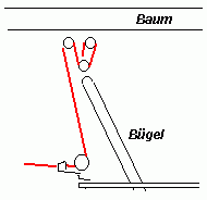 Die Teilung der Schot muss so konstruiert sein, dass der Übergang durch die Umlenkrolle am Baumende passt. Nur dann ist es möglich, den Baum bei jedem Mastfall in die Mitte zu ziehen.