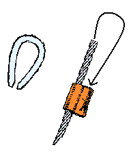 Etwas Geschicklichkeit braucht es nun, die Schleife mit dem langen Drahtseil zu zu ziehen, dabei die Kausch einzulegen ohne dass das kurze Ende wieder herausspringt. (Kleiner Trick: Die Hülse beim kurzen Ende leicht quetschen - mit Zange, Polygrip o.ä. - damit es klemmt und nicht so leicht rausrutscht.) |