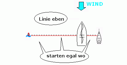 Steht das Boot im Wind, zeigt der Bug auf die Seite, auf der du starten solltest. Zeigt er auf keine Seite, ist die Startlinie eben ausgelegt und es spielt keine Rolle, wo du startest.